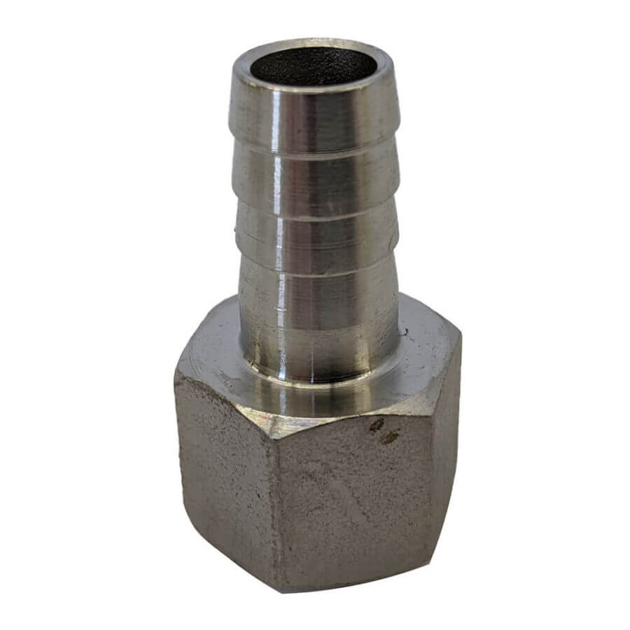 1/2″ female NPT thread stainless steel barbed fitting for connecting soft-sided tubing in low-pressure applications.