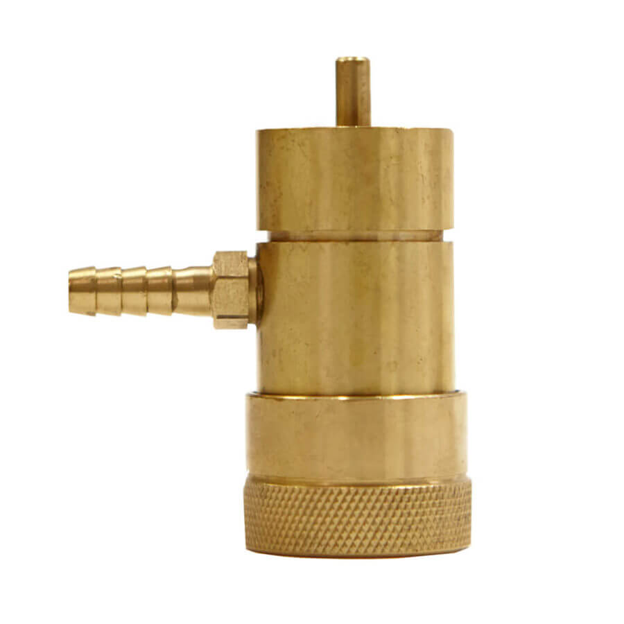 Portable Beverage Oxygen Regulator with 1/4″ Barbed Outlet. This is commonly used with disposable oxygen tanks. The knob on the top adjusts the pressure.