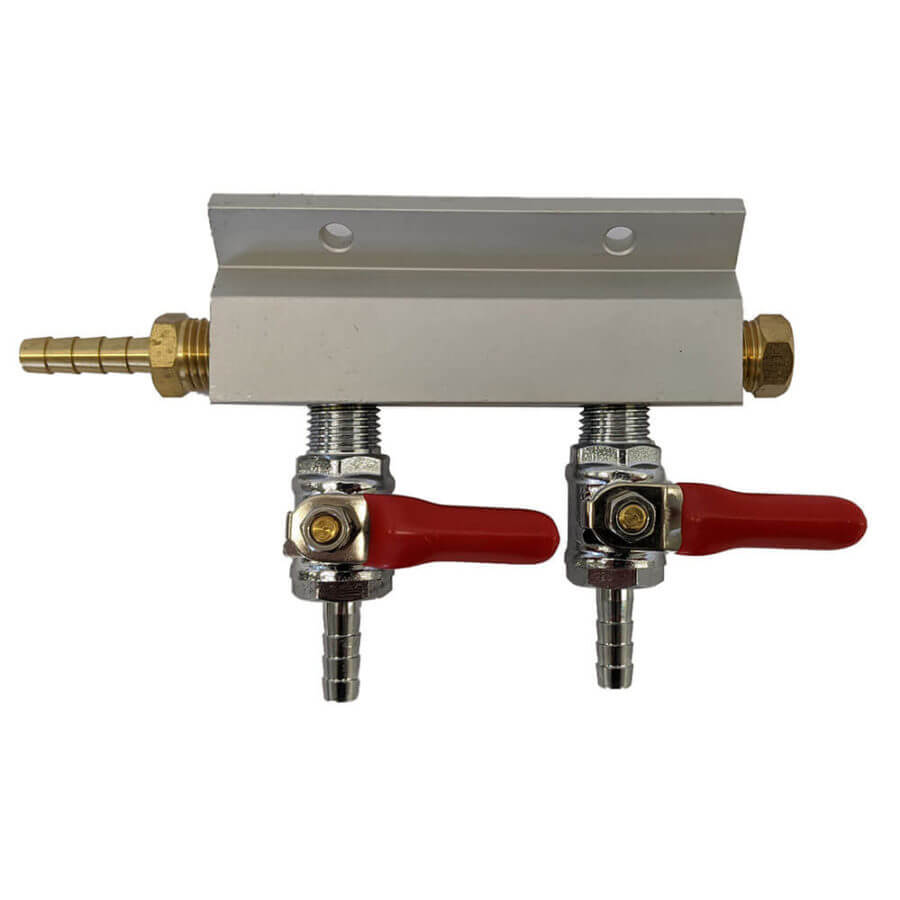 When you want to run two kegs from a single CO2 cylinder, a 2-Way compressed gas 1/4″ manifold is a great way to save time, space, and money. Plus you have the option to shut one outlet off without having to stop the flow of the second with the individual shut off valves.